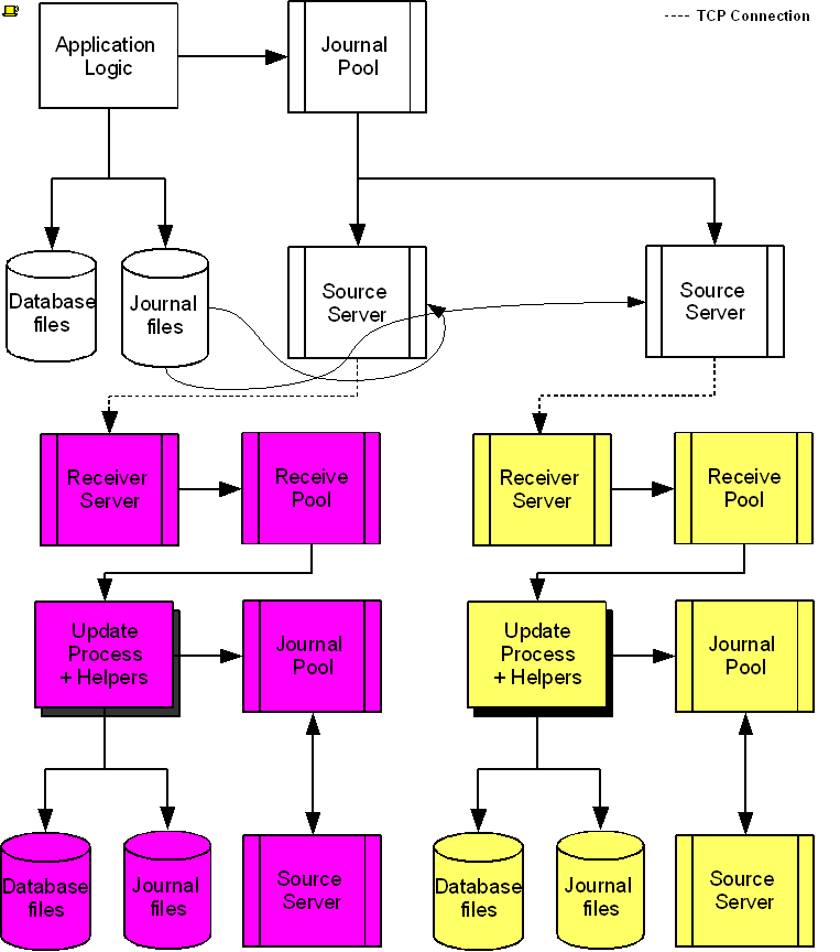On the secondary, the receive server process communicates with the primary and feeds a stream of update records into the receive pool. The update process reads these update records and applies them to the journal and database files via the journal buffers and global buffer cache in shared memory. Helper processes operate as follows: